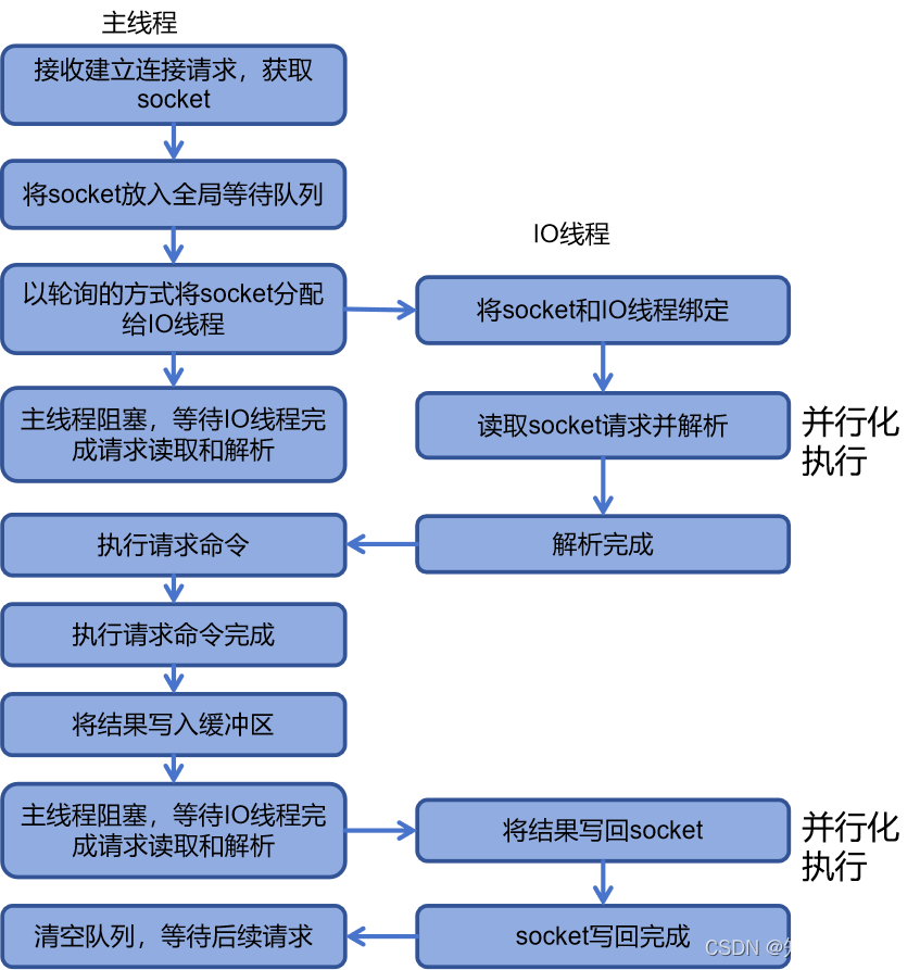 简单来讲,新增了多线程的功能来提高 I/O 的读写性能,他的主要实现思路是将主线程的 IO 读写任务拆分给一组独立的线程去执行,这样就可以使多个 socket 的读写可以并行化了,采用多路 I/O 复用技术可以让单个线程高效的处理多个连接请求(尽量减少网络IO的时间消耗),将最耗时的Socket的读取、请求解析、写入单独外包出去,剩下的命令执行仍然由主线程串行执行并和内存的数据交互。