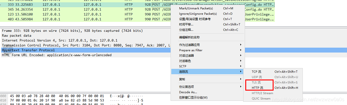 选择要查看的报文,右键选择追踪流- HTTP流。