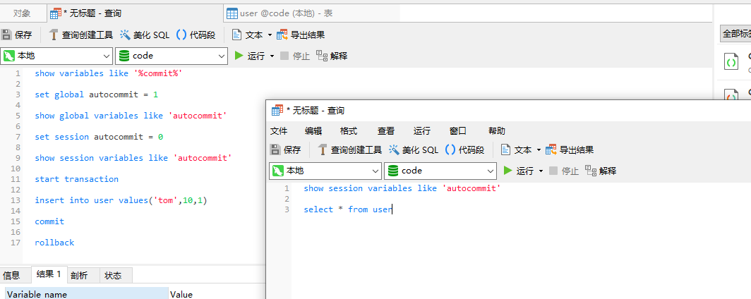 show variables like '%commit%' // 查询当前会话环境变量