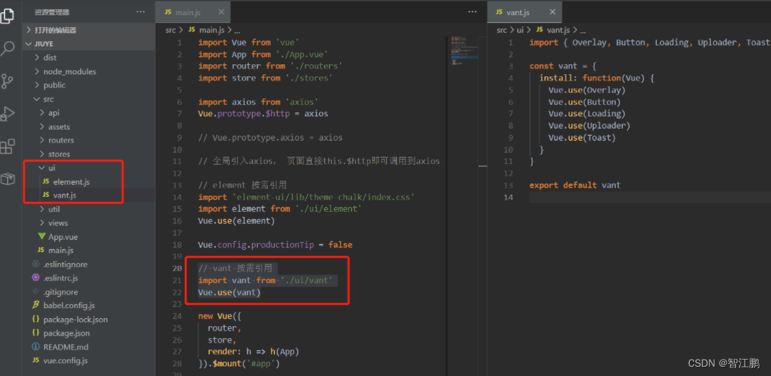 1. 在src目录文件夹下新建一个文件夹,这里我命名的是ui。里面创建vant.js文件,内容如下:
