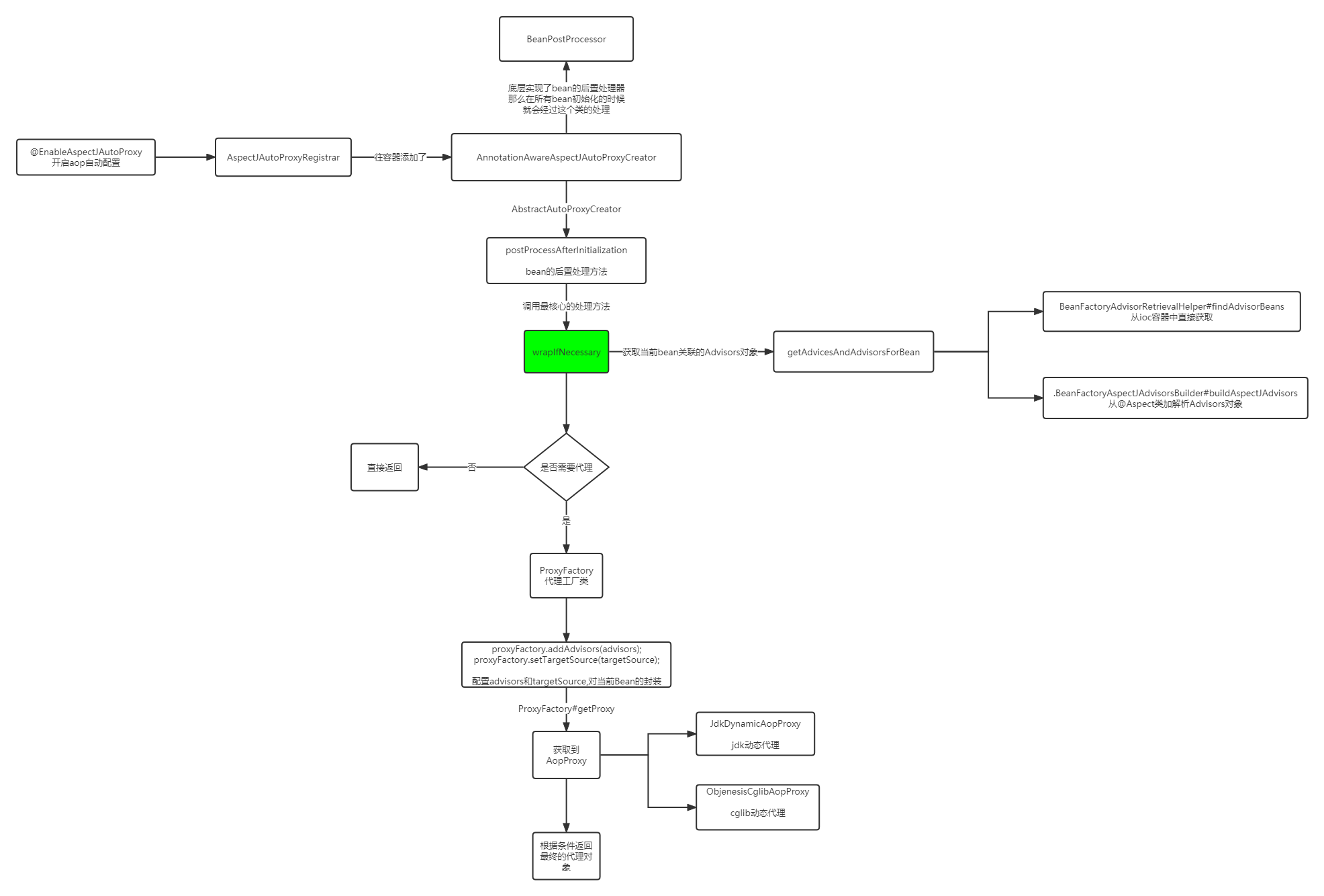 整个流程其实并不复杂,只要理解了核心的几个对象,加上些许的Ioc容器工作过程,就可以理解了,源码的入口其实就是在AnnotationAwareAspectJAutoProxyCreator这个对象的后置处理方法中进行的,主要是这个方法AbstractAutoProxyCreator#wrapIfNecessary进行了包装,当然了这个还会涉及到循环依赖问题,这里就不说了