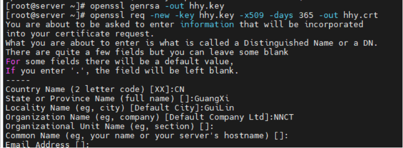 openssl req -new -key hhy.key -x509 -days 365 -outhhy.crt