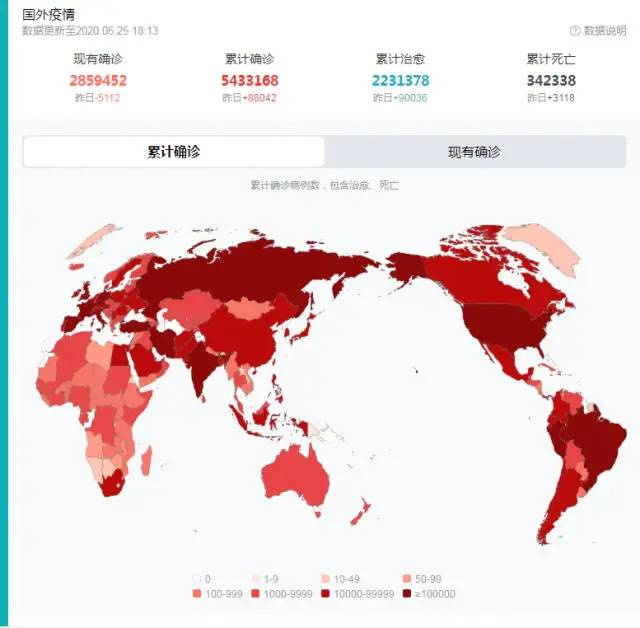 看个报道吧,截止写这篇文章的时候,全球疫情情况(来源:百度疫情动态,时间2020-5-25)