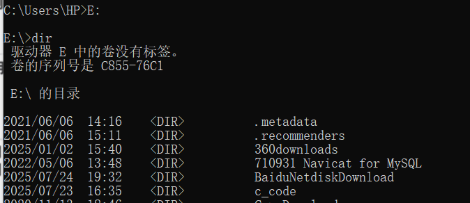 盘符名称+冒号:盘符切换;例:E:回车,表示切换到E盘