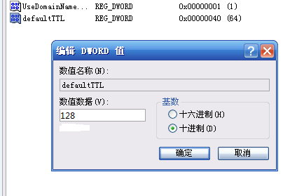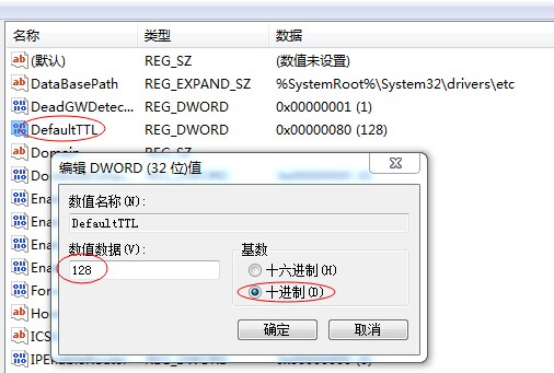 (4).选择HKEY_LOCAL_MACHINE\SYSTEM\CurrentControlSet\Services\Tcpip\Parameters,然后再右侧你就可以看到DefaultTTL,然后你双击或右键点击即可修改。注意:在“基数”哪里选择“十进制”,然后在左边的框内输入“128“,然后点击确定,重启电脑即可。