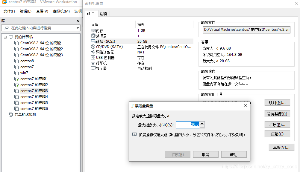 1、关机虚拟机之后,右键“设置”--->"硬盘"--->"扩展"
