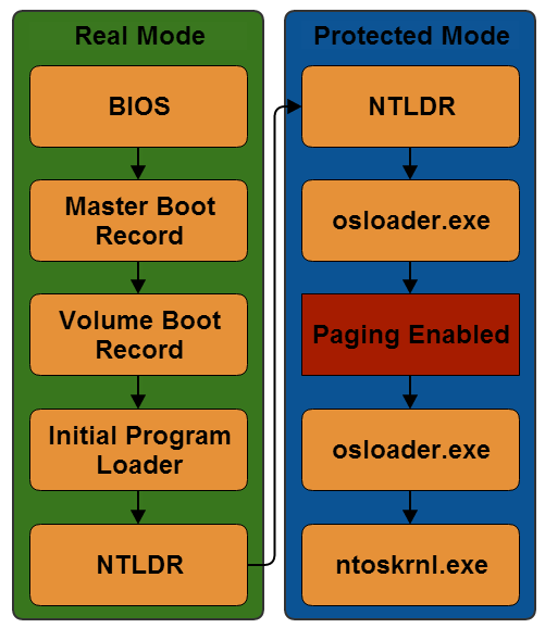 NTLDR(New Technology Loader):NTLDR是一个“实际”文件,驻留在C:\NTLDR并具有属性FILE_ATTRIBUTE_HIDDEN和FILE_ATTRIBUTE_SYSTEM(MBR,VBR和IPL无法从文件系统访问),它在地址0x20000处执行。TLDR由2个主要部分组成:1.NTLDR - 16位实模式和保护模式代码的混合,可在两种模式之间切换,以便使用BIOS中断。 2.OSLOADER.exe - 一个PE文件(编译为驱动程序),由32位代码组成,在保护模式下执行。NTLDR将设置GDT和IDT,然后进入保护模式(分页仍未设置)。OSLOADER.exe从NTLDR中提取并加载其入口点0x401000,这是因为OSLOADER是PE文件,如果位于0x401000,则不需要重定位表。NTLDR调用0x401000(OSLOADER入口点)。
