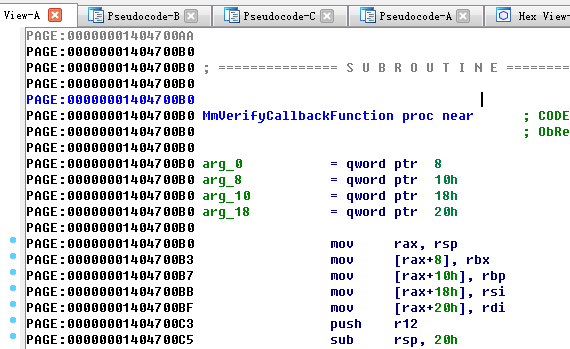 在 IDA 中加载 64 位 Windows 7 SP1 的 ntoskrnl.exe 文件并指定 pdb 文件,在 IDA View-A 页面中定位到前面获得的函数地址偏移位置 PAGE:00000001404700B0,即定位到该函数所在。