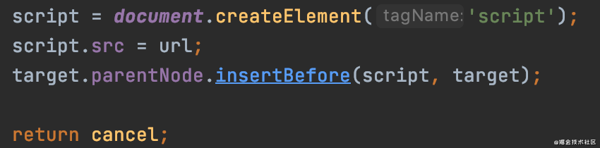 创建<script>标签,并挂载到页面上。最后返回取消函数。