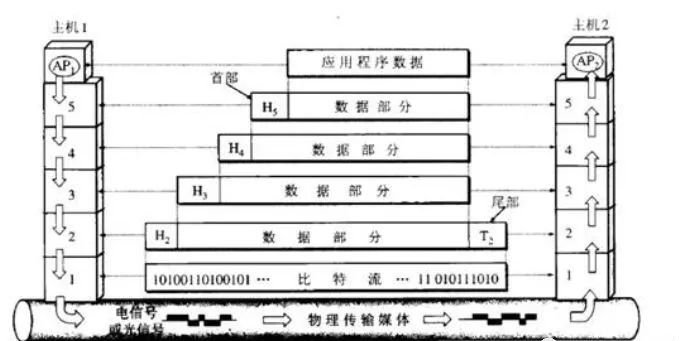 假定网络中两个主机是相连的,它们之间传输数据,应用进程的数据在各层之间的传递过程中所经历的变化,如下图所示。