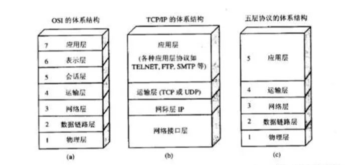 计算机网络的体系结构有两种:(1)OSI的七层协议体系结构,概念清楚,理论完整,但它既复杂又不实用。(2)TCP/IP四层体系结构,它得到了广泛的应用,不过从实质上讲,TCP/IP只有最上面的三层,因为最下面的网络接口层并没有什么具体内容。因此在学习计算机网络的原理时采用折中的办法,即综合OSI和TCP/IP的优点,采用一种只有五层协议的体系结构。