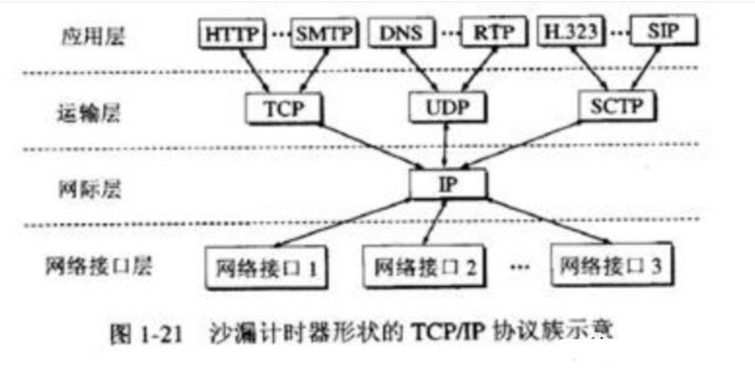通常我们所说的TCP/IP协议,是指TCP/IP协议族,即TCP/IP四层的所有协议集合。TCP/IP协议族的特点是上下两头大而中间小:应用层和网络接口层都有多种协议,而中间的IP层很少,上层的各种协议都向下汇聚到一个IP协议中。折中很像沙漏计时器形状的TCP/IP协议族表明:TCP/IP协议可以为各种各样的应用提供服务,同时TCP/IP协议也允许IP协议在各种各样的网络构成的互联网上运行。不难看出IP协议在一天入网中核心作用。