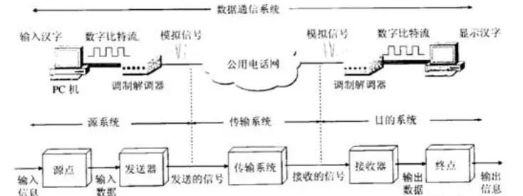 一个数据通信系统可以划分为三大部分,即源系统(包括源点和发送器)、传输系统和目的系统(包括接收器和终点)。信息变化过程是:电脑中文字转化为数字比特流(数字信号),通过调制解调器转化为模拟信号,将模拟信号发送到接收端,接收端将模拟信号转化为数字比特流(数字信号),再转化为文字,在电脑中显示。具体流程如图: