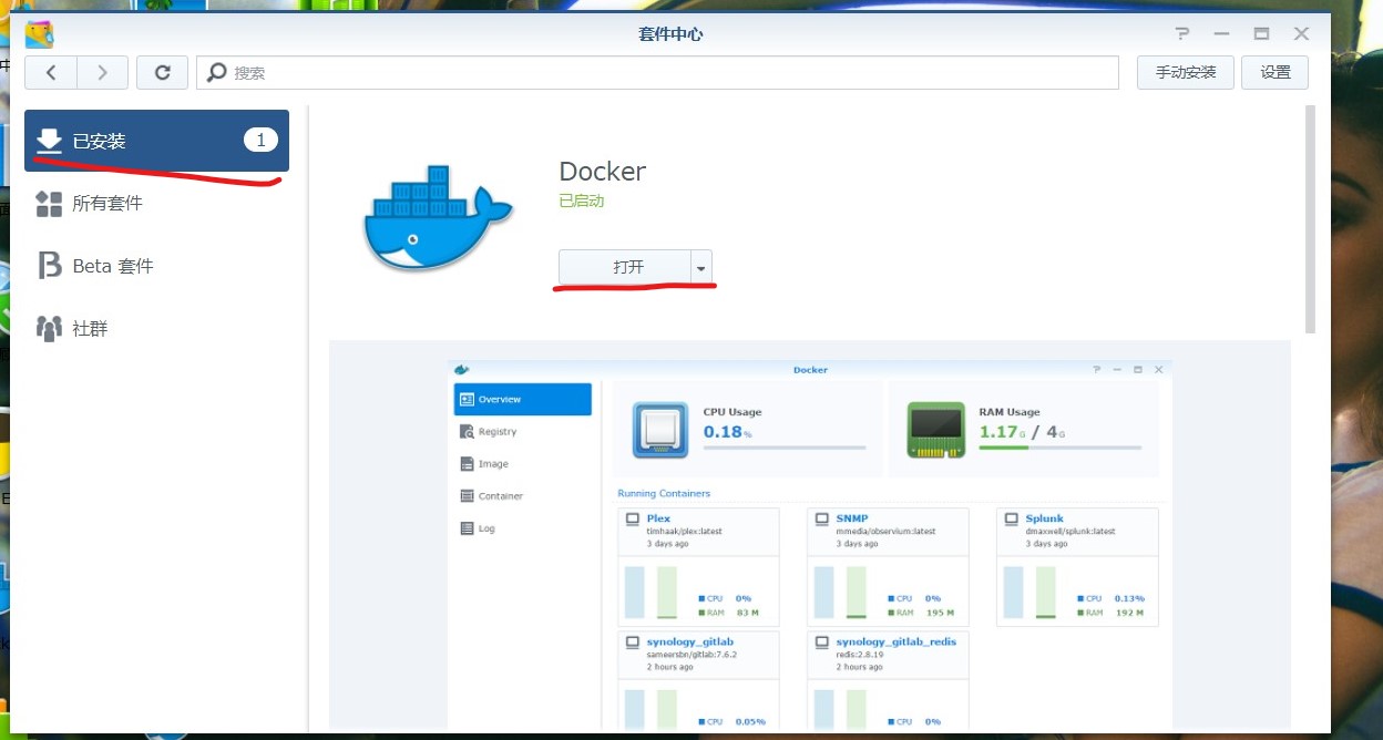 - 确认是否已安装docker套件.确认路径:套件中心>已安装>docker