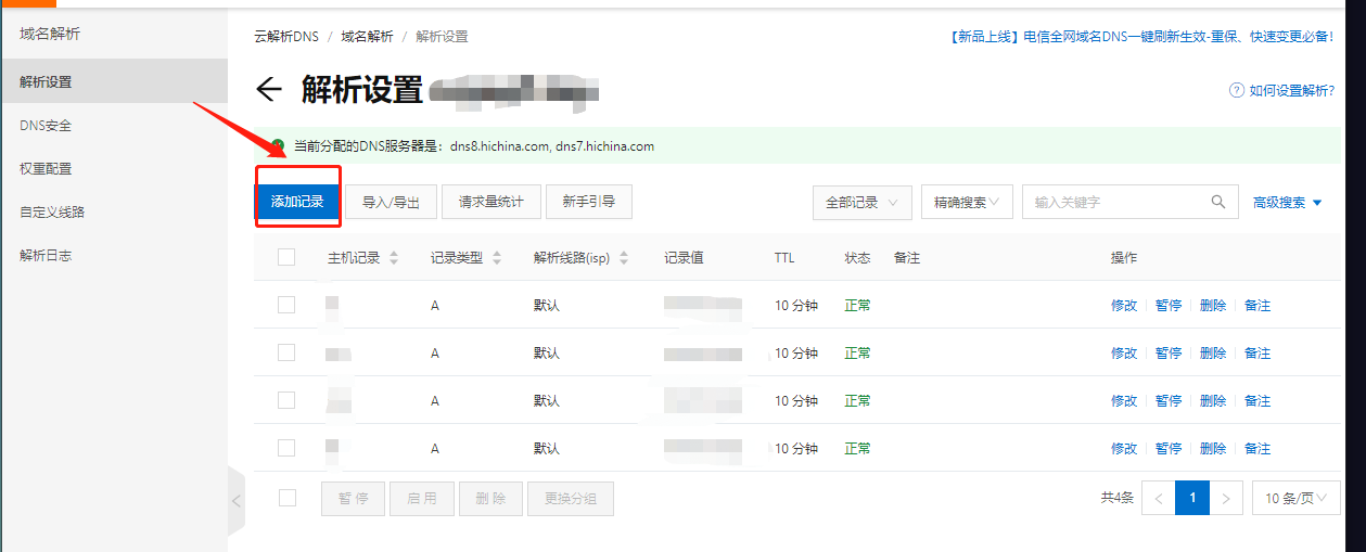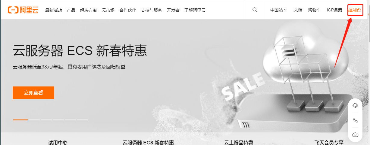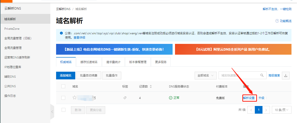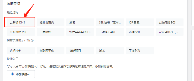 进入阿里云首页后选择控制台,然后进入云解析DNS页面
