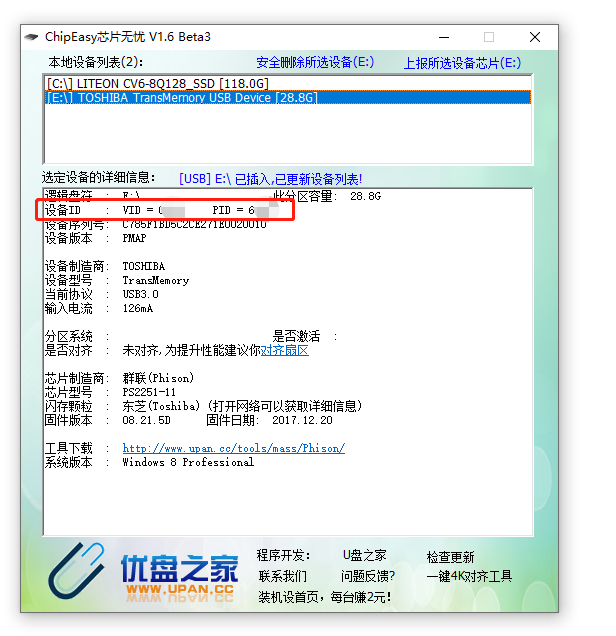 第二步骤:打开芯片无忧软件,选中我们的U盘,需要记录一下设备ID。