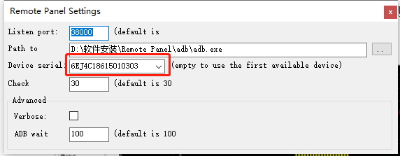 将电脑与手机使用数据线链接,鼠标右键点击图标找到settings进入(手机务必打开开发者模式和USB调试授权-百度一下就知道怎么弄很简单)device serial框内选中自己手机的代号即可。