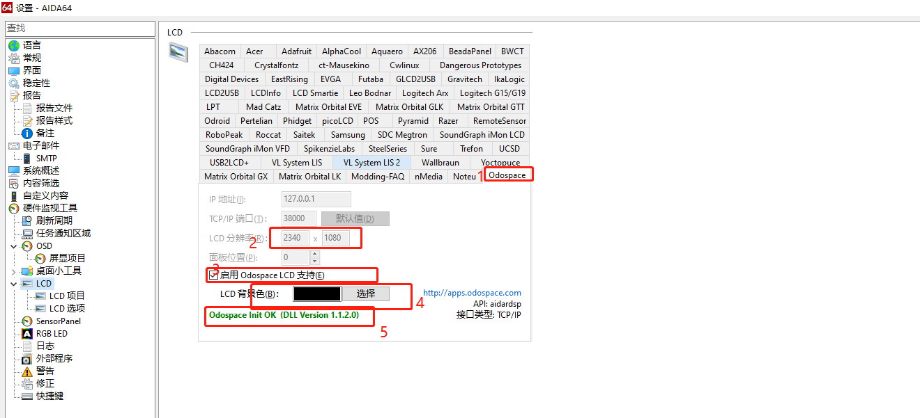 进入此页面后找到odospace,在第一个框内点击,第二个框内填入自己手机的分辨率,第三个位置勾选,第四个位置选一个自己喜欢的颜色,第五个位置显示为绿色字体即为正常,红色字体即为异常缺少文件,我把该文件放置文末需要自取,将该文件放入aida64安装路径下即可(放置后退出从新进入软件)
