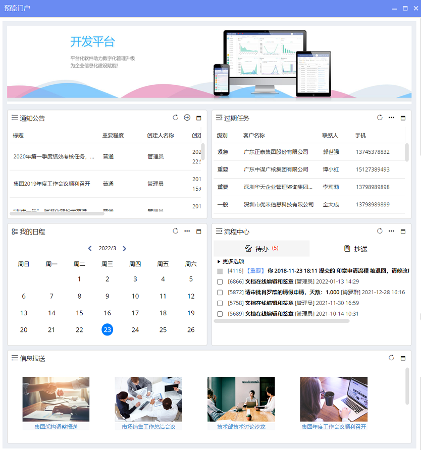 门户引擎,即企业经营数据统计信息的展示。在流程中提取业务数据和过程数据,自动统计汇总和生成图表,通过平台门户展示,各层级领导可以直接查看、筛选各类数据,实时掌握企业动态;支持一键生成移动端、电脑端、大屏端等多屏互动,数据实时同步。