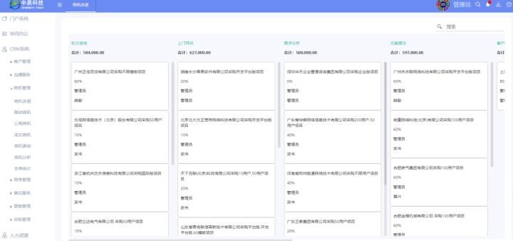 以常见模板为例,中易在该模块下建立了商机泳道、跟进商机、成交商机、商机查询、商机分析、丢单统计等子模块来实现业务商机的高效管理,泳道式展现商机跟进过程,商机信息清晰明了。