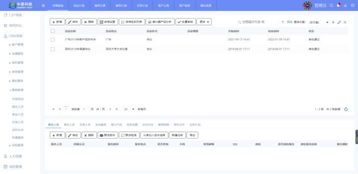 该模块主要的作用是管理市场营销活动,在销售过程中,营销活动是提升品牌形象,达成合作的关键,如组织沙龙、促销活动等线下活动,都可以提高品牌曝光率,对于每一次市场活动都可以通过系统发起,所涉及到的人员信息、客户信息自动归档到系统中,支持生成数据分析报表,帮助企业快速分析活动转化效果,实现更多二次销售机会。