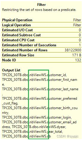再次检查原始查询的执行计划。 现在,联接数从 17 个更改为 5 个,并且没有随机排布。 选择计划中的“筛选操作”图标,其“输出列表”将显示已从具体化视图而不是基表读取了数据。