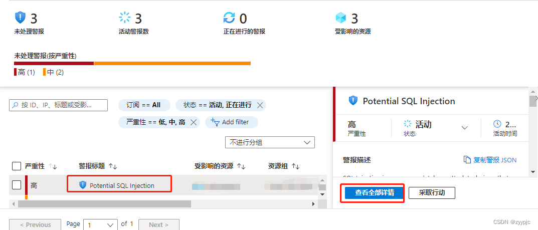 点击左侧的安全警报,同时在右侧就出现了报警明细,找到Potential SQL Injection并点击。