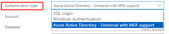 选择连接认证方式,此处我们可以看到有SQL Login/Windows Authentication/Azure Active Directory--Universal with MFA support