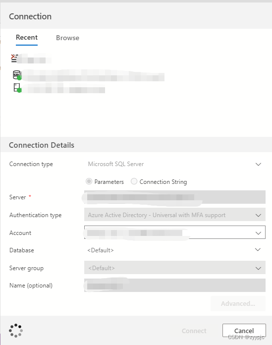 本文采用第一/三种即SQL Login和AAD-Universal with MFA support方式进行连接数据,具体填写方式如下: