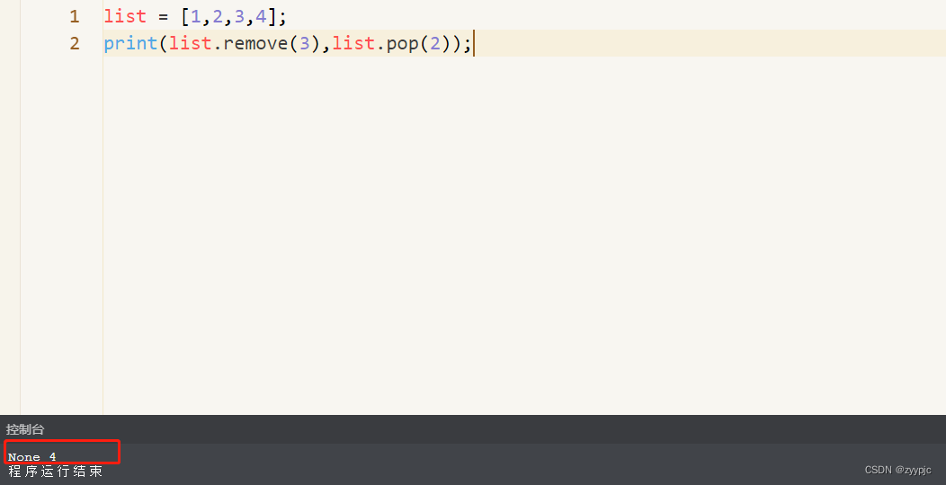 remove()掉索引号为3的元素后,列表为[1,2,4],但是remove不会有返回值,所以print的结果为None。pop(2)在列表[1,2,4]上删除索引位为2的元素,即4这个元素,并有返回这个元素的值,最终print出来是4。综上所述,print出来两个结果为None和4。