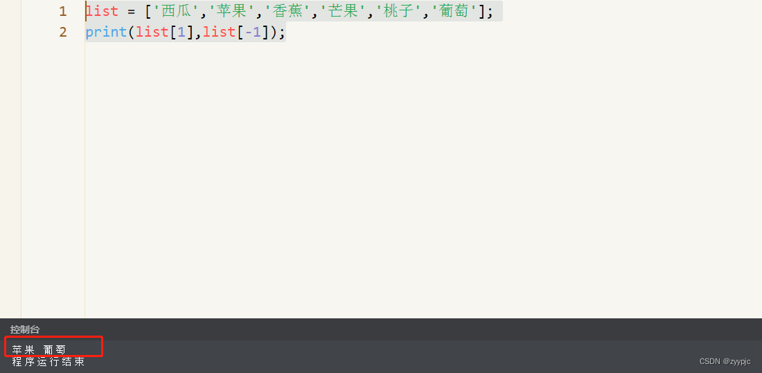 这个案列涉及列表的索引与访问。列表从左边计起索引号从0开始,从右边计起索引号从-1开始。所以索引号1位苹果,-1位为葡萄。