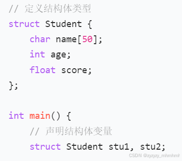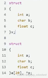 如图中所示就是结构体变量声明的例子,在其中,必须要加上struct这个结构体关键字,struct后面则是加上结构体类型名,大括号内的内容是成员变量,在末尾有一个分号,我们可以在大括号和分号之间进行结构体类型的创建也可以在主函数内创建(两种方式所不同的差别是变量的作用域不同,一个全局一个局部)。