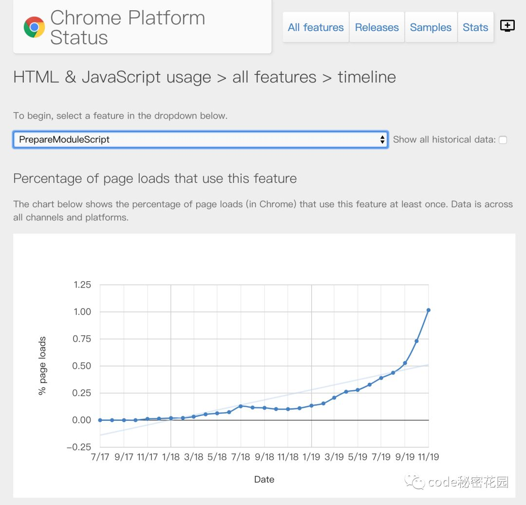 虽然主流浏览器都已经支持了 ESM,但是根据 chrome 的统计,有用到 <script type="module"> 的页面只有 1%。截图时间为 2019/11。