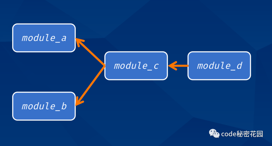 如果有两个模块 a 和 b ,同时引入了模块 c,但是这两个模块还需要导入模块 d,如果模块 a、b 在导入 c 之后,再导入 d 也是可以的,但是有些繁琐,我们可以直接在模块 c 里面导入模块 d,再把模块 d 暴露出去。