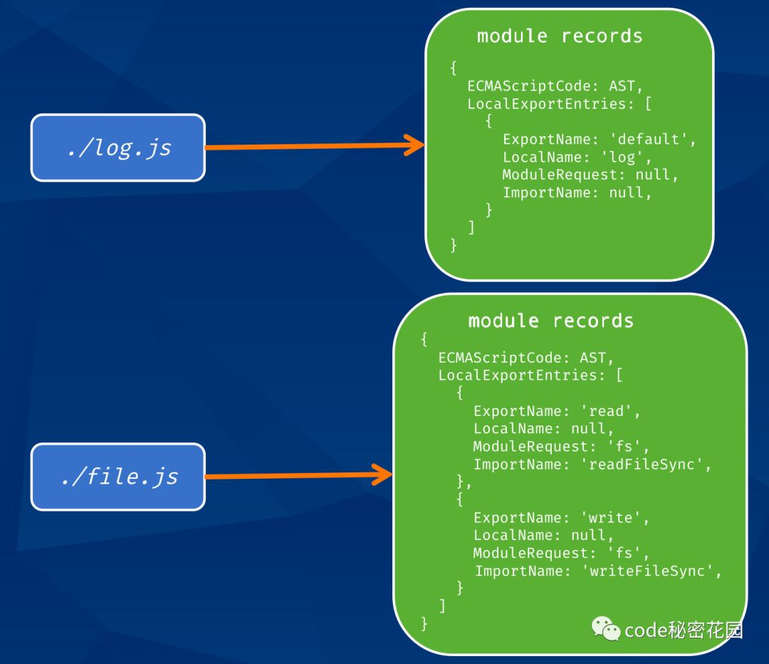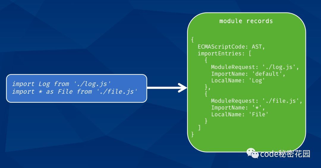 值得注意的是,刚开始拿到入口文件,我们并不知道它依赖了哪些模块,所以必须先通过 js 引擎静态分析,得到一个模块记录,该记录包含了该文件的依赖项。所以,一开始拿到的 js 文件并不会执行,只是会将文件转换得到一个模块记录(module records)。所有的 import 模块都在模块记录的 importEntries 字段中记录,更多模块记录相关的字段可以查阅 tc39.es。