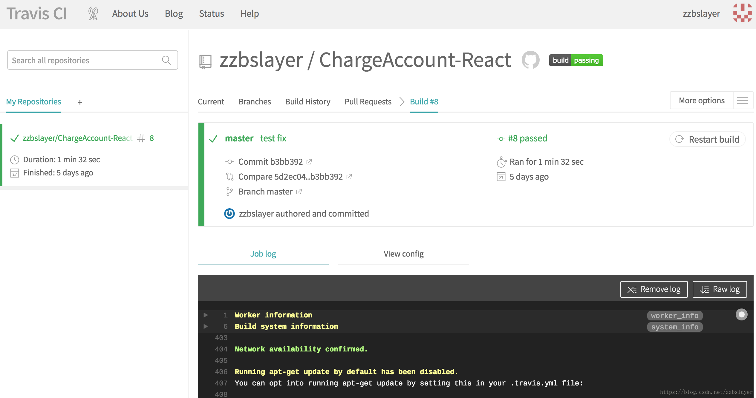 至此,travis-ci配置就结束了。可以尝试修改项目,并且提交一次commit。在travis-ci中可以看到ci结果。