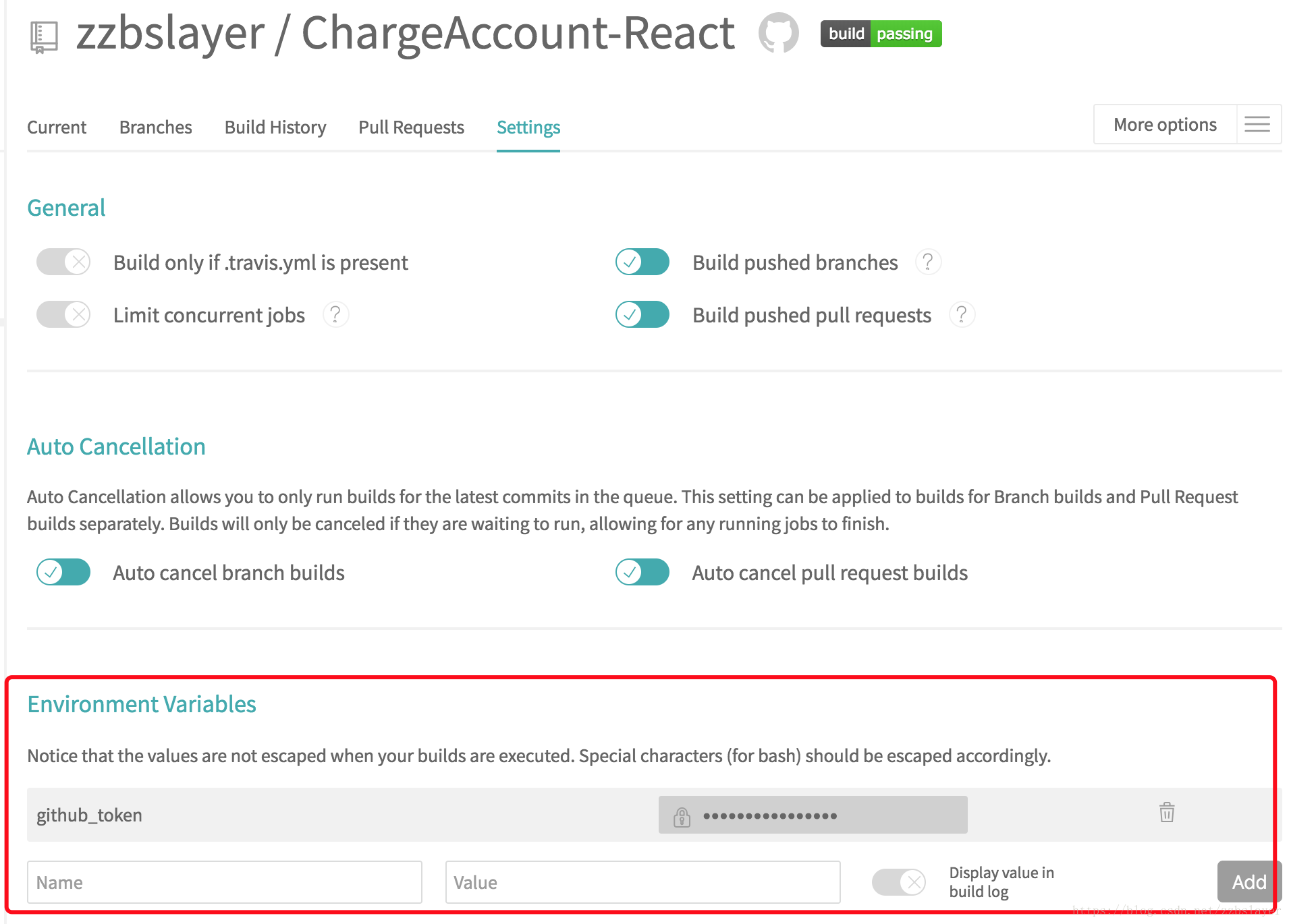 然后进入travis-ci repo,settings > environmental variables 中刚刚将生成的github_token添加。