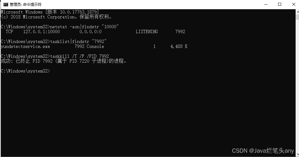 强制(/F参数)杀死 pid 为 7992 的所有进程包括子进程(/T参数):
