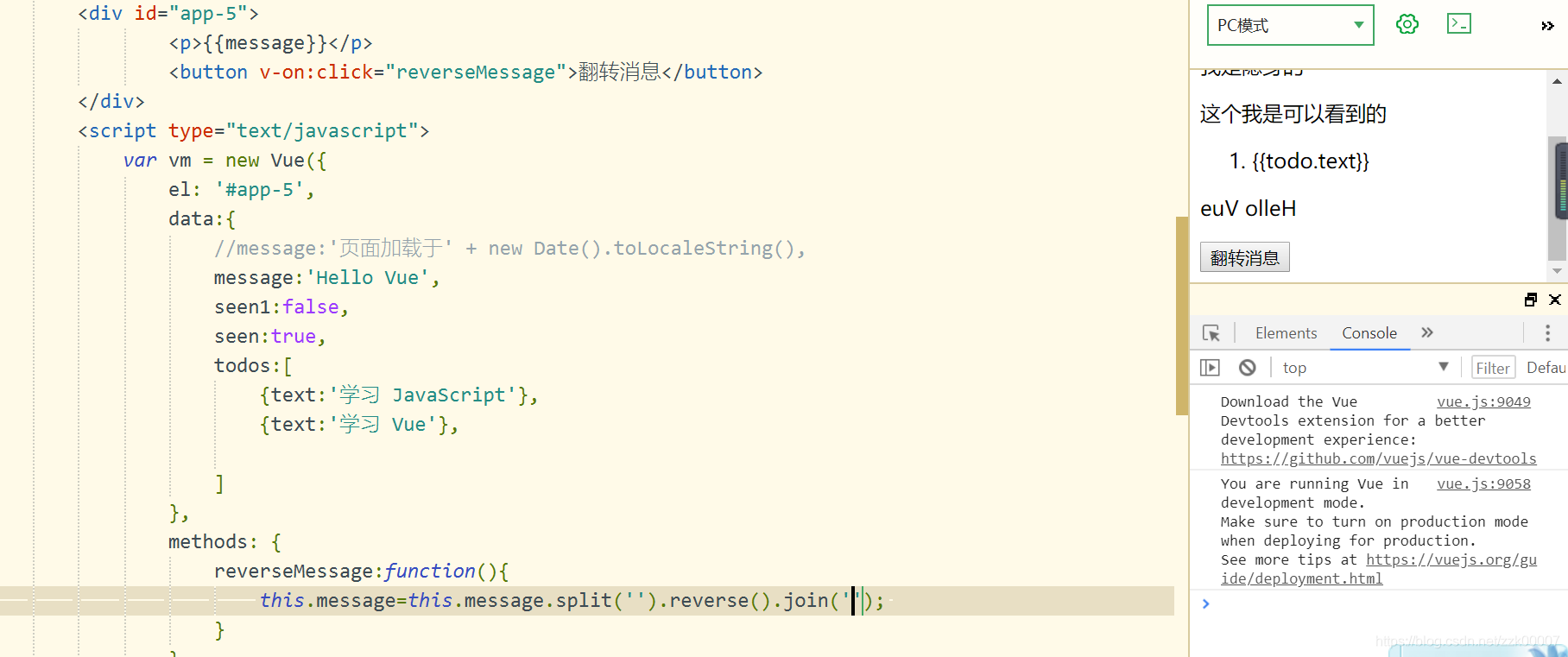 注意在 reverseMessage 方法中,我们更新了应用的状态,但没有触碰 DOM--所有的DOM操作都由 Vue 来处理,编写的代码只需要关注逻辑层面即可。