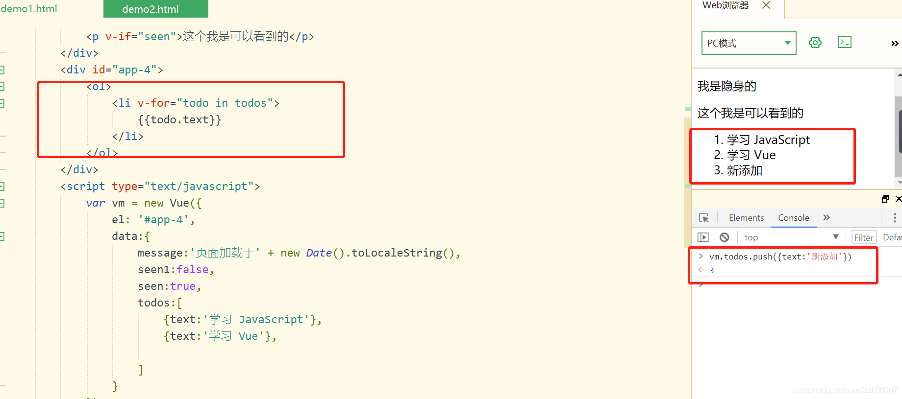 在控制台,通过vm.todos.push({text:'新项目'}),发现在最后添加列表。