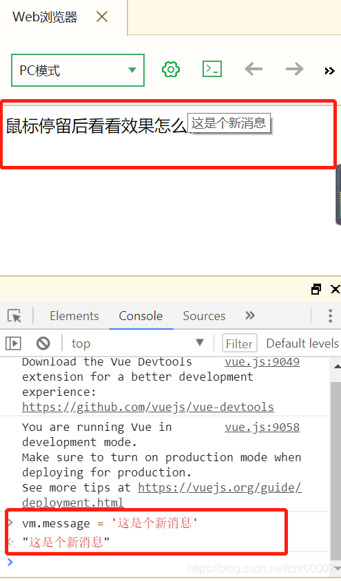 这个时候如果再次打开浏览器的 JavaScript 控制台,输入 vm.message = '新消息', 就会看到这个绑定了 tittle 特性的 HTML 已经进行了更新,如图所示: