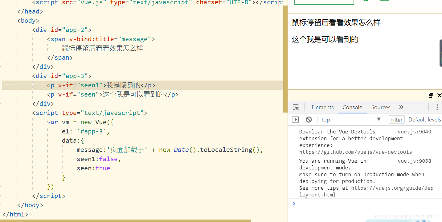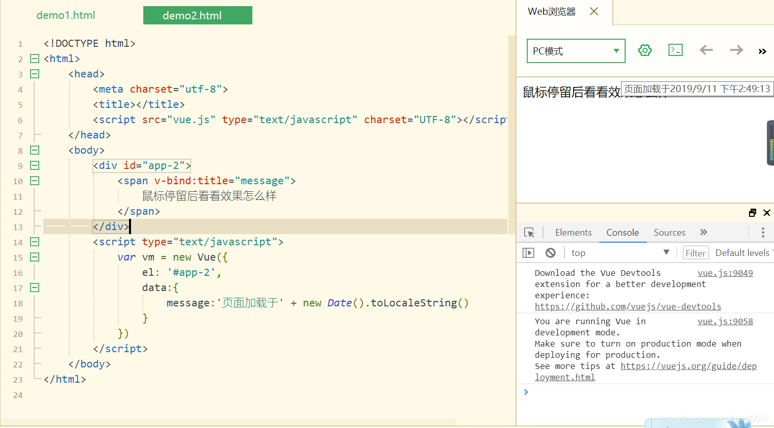 这里我们遇到了一些新的东西。 v-bind 特性被称为指令。指令带有前缀 v- 以表示它们是 vue 提供的特殊特性。它们会在渲染的 DOM 上应用特殊的响应式行为。 在这里,该指令的意思是:“将这个元素节点的 tittle 特性和 Vue 实例的 message 属性保持一致。”