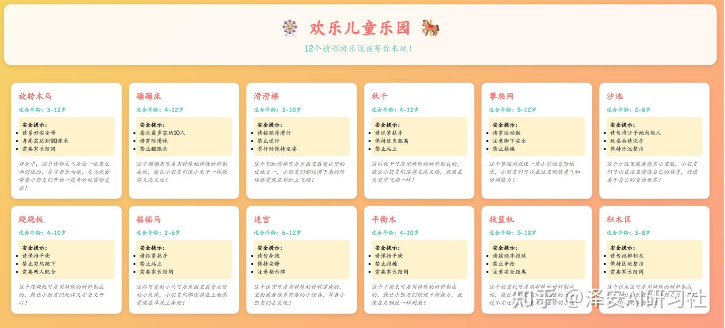 提示词:我家附近新开了一个超棒的儿童乐园,有 12 种不同的游乐设施!我想让 AI 帮我生成一个展示乐园信息的网页,页面是欢乐、卡通风格,要色彩丰富又整洁,包含每个设施的名称、适合的年龄、安全提示和趣味小故事