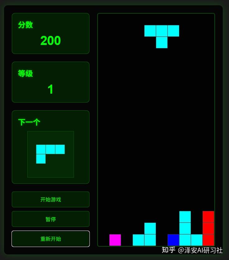 提示词:写一个俄罗斯方块的小游戏,要求:1。 使用 hml 来写,2。 界面具有科技感,3。 具有积分,等级,暂停,重新开始等功能;
