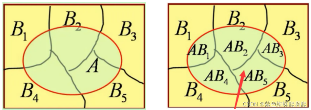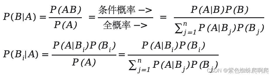 事件 B1,B2,...Bn 构成实验E的完备事件组,即它们两两不相容,和为全集。且 P(Bi)>0 ,A为E的一个事件。则: