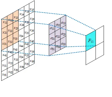 如图4,蓝色map视为F1,大小为5*5,经过一个3*3大小的卷积,输出橙色map,命名为F2。根据公式(1),F2大小为3*3,一个F2的像素点对应F1的感受野是3*3。再次经过一个3*3大小的卷积,输出荧光蓝map,命名为F3。根据公式(1),F3大小为1*1,一个F3的像素点对应F1的感受野是5*5。