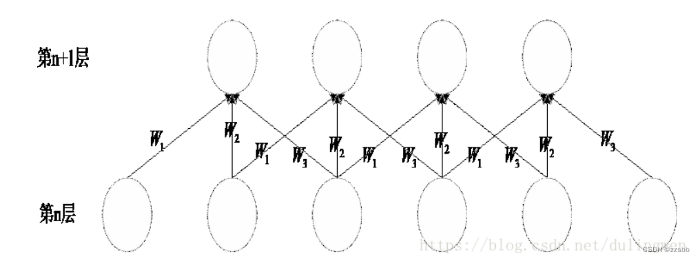 局部连接又叫稀疏连接,就是卷积层的节点不与前一层的全部节点进行连接,仅与部分节点进行连接。这样做的目的也非常好理解,减少参数量,加快学习速率,减少过拟合。如图2,是局部连接的示意图,读者可以自行计算与全链接相比,减少了多少计算量。