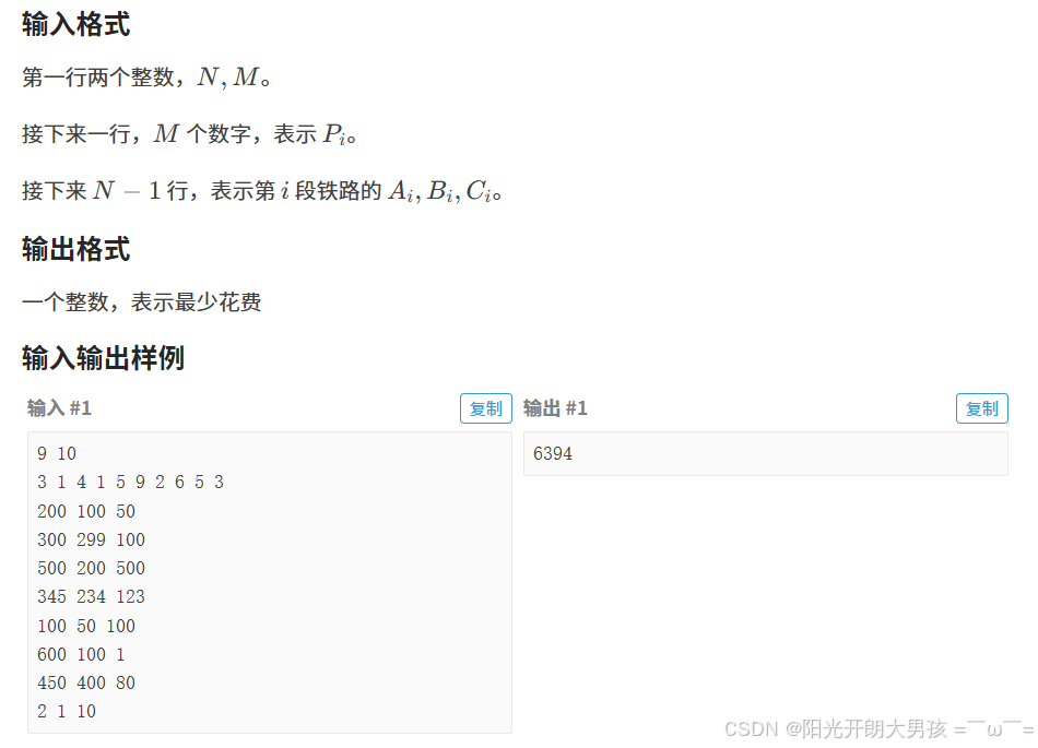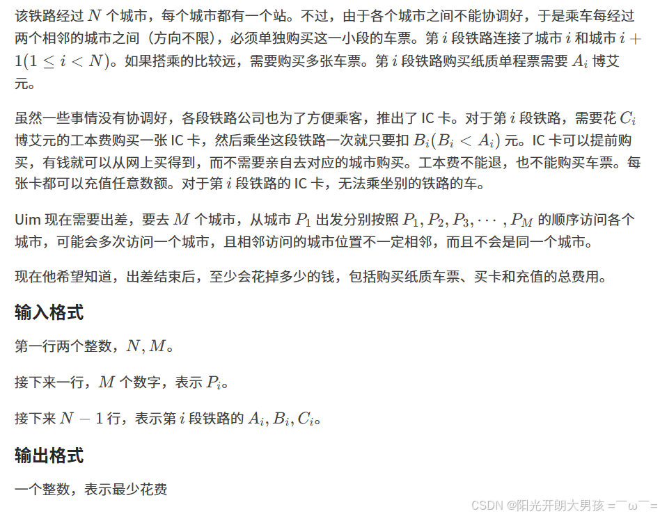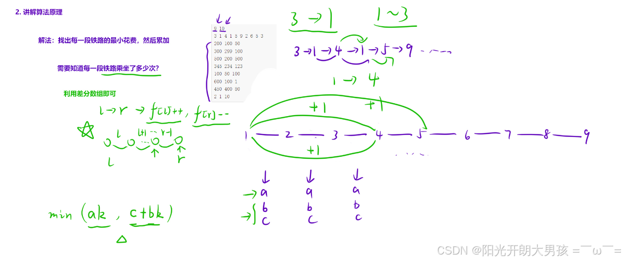 先考虑如何让花费最⼩,想要求最⼩花费,需要知道每⼀段⾼铁被「乘坐了多少次」,记作么最⼩花费就是「买票的花费」与「买卡的花费」两者之间的最⼩值: