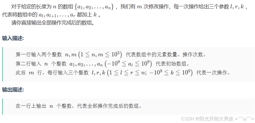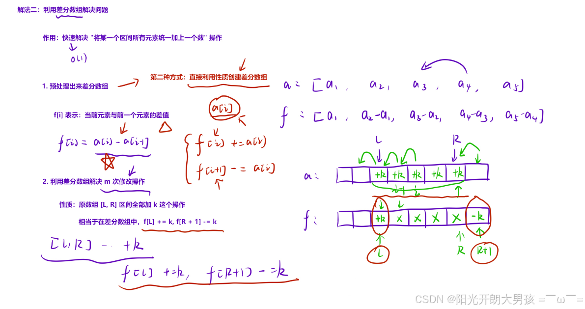 - 还原经过 q 次询问之后的 a 数组:对差分数组做⼀次「前缀和」,就可以还原出原数组