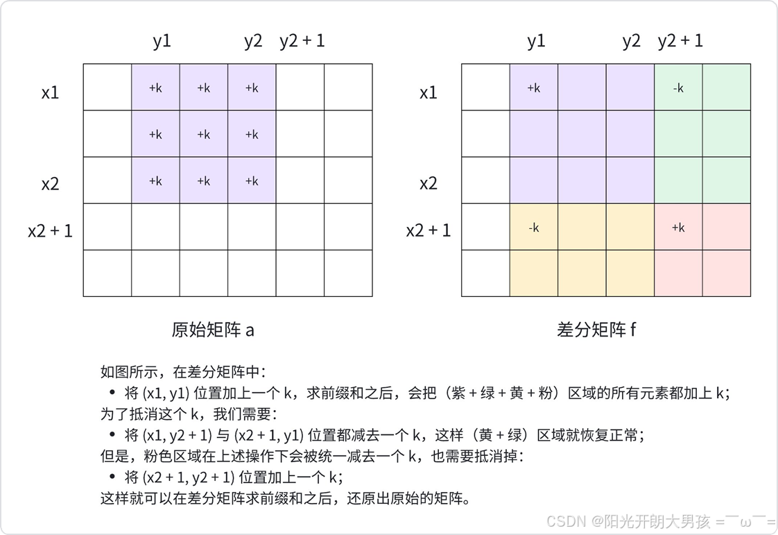 可以类⽐「⼀维差分数组」的性质,推导出「⼆维差分矩阵」的性质: